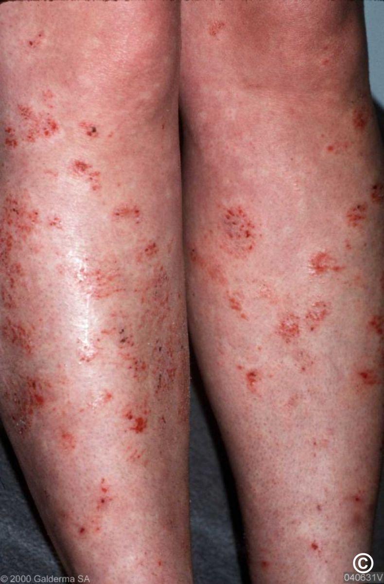 Discoid eczema is an idiopathic condition and its manifestations typically include sharply defined, oval, or coin – shaped eczematous plaques. The plaques exhibit small vesicles in the early stages, and towards the later stage these become more scaly, dry and thickened. The eczematous patches are numerous but symmetrically distributed and their size ranges from 1 – 10 cm in diameter. Mild to intense itching usually accompanies the affected areas.