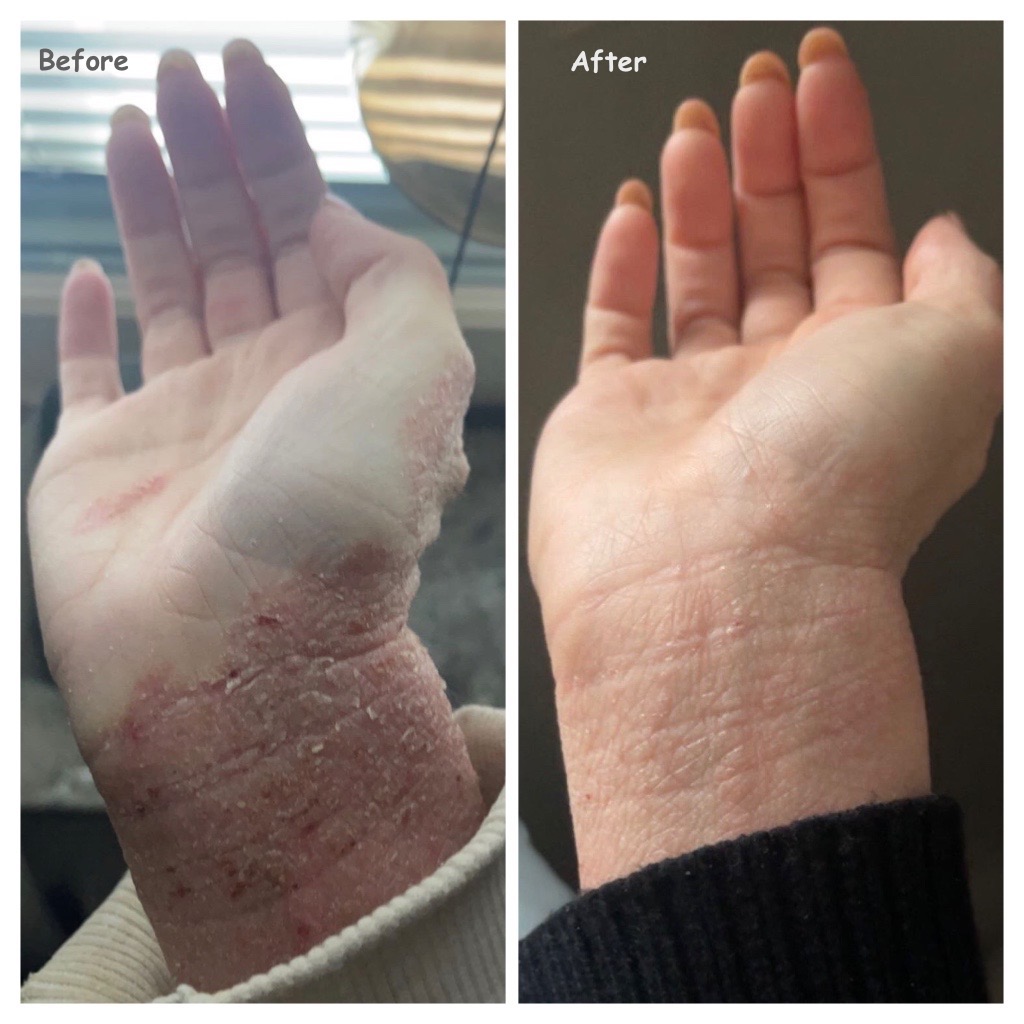 Four weeks after using the remedies, Kate reported a marked improvement in her skin – her arms and hands were substantially healed (as shown in the illustration above). Her legs and torso were experiencing much less dry skin and flakes, with moisturiser needing to be applied a few times a day. Her face and neck, which earlier would bleed from excessive scratching, had healed noticeably. The redness (often also referred to as Red Skin Syndrome) was also significantly better. The overall progress that she made in four weeks was extremely positive.