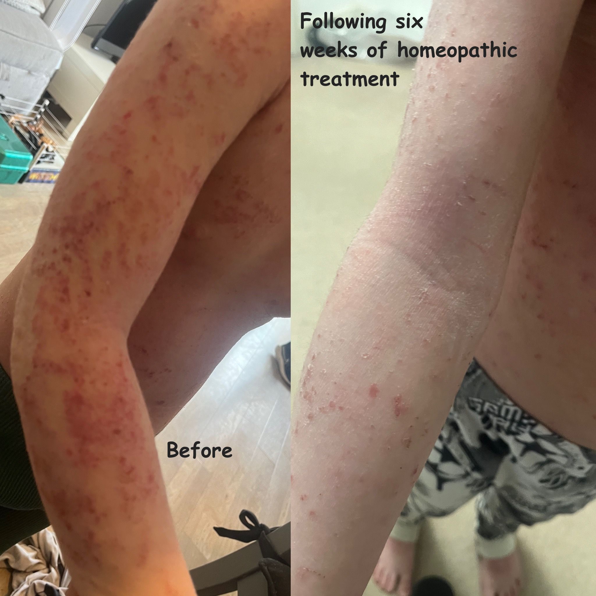 Kate had sluggish bowels movements which occurred once in 3-4 days and a tendency towards constipation. I prescribed her a bowel nosode remedy aimed at stimulating the gut. I often see in my practice that a healthy gut has a direct positive effect on skin health.
